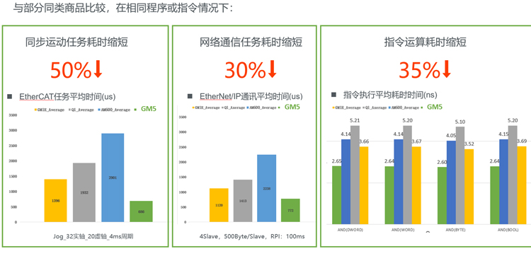 與部分同類商品比較,在相同程序或指令情況下,同步運動任務耗時縮短50%,網(wǎng)絡通信任務耗時縮短30%,指令運算耗時縮短35%。