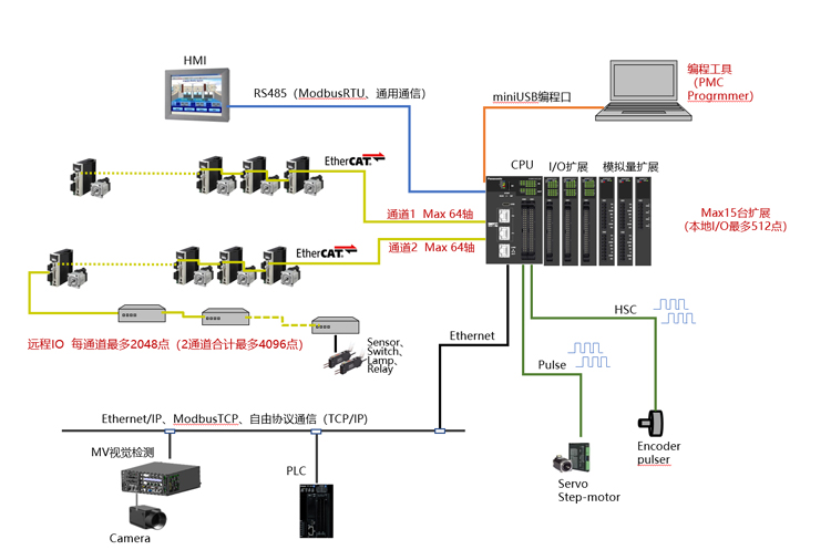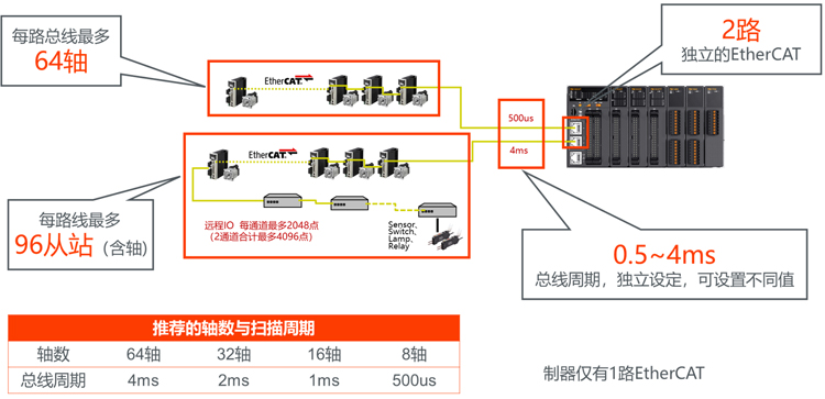 2路獨立EtherCAT總線,最多可連接128軸網(wǎng)絡伺服。