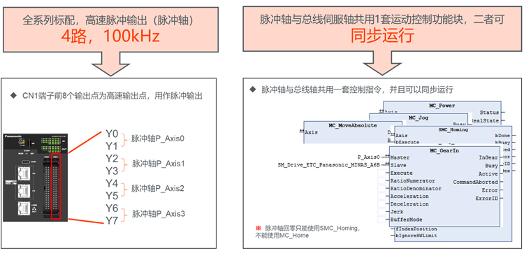 4路高速脈沖輸出,脈沖伺服(或步進)可與總線伺服同步運行。