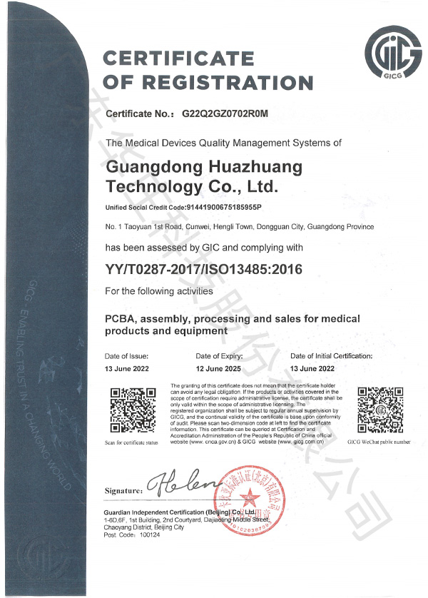 此次在公司領(lǐng)導(dǎo)的指揮及各部門積極配合下,經(jīng)過專家的全面、嚴(yán)格、細(xì)致的指導(dǎo)和審核確認(rèn)華莊科技質(zhì)量管理體系符合ISO 13485:2016醫(yī)療器械 質(zhì)量管理體系 的要求,獲得了GICG認(rèn)證ISO 13485:2016的證書,本次認(rèn)證范圍: 醫(yī)療產(chǎn)品及設(shè)備用PCBA.組裝加工與銷售。